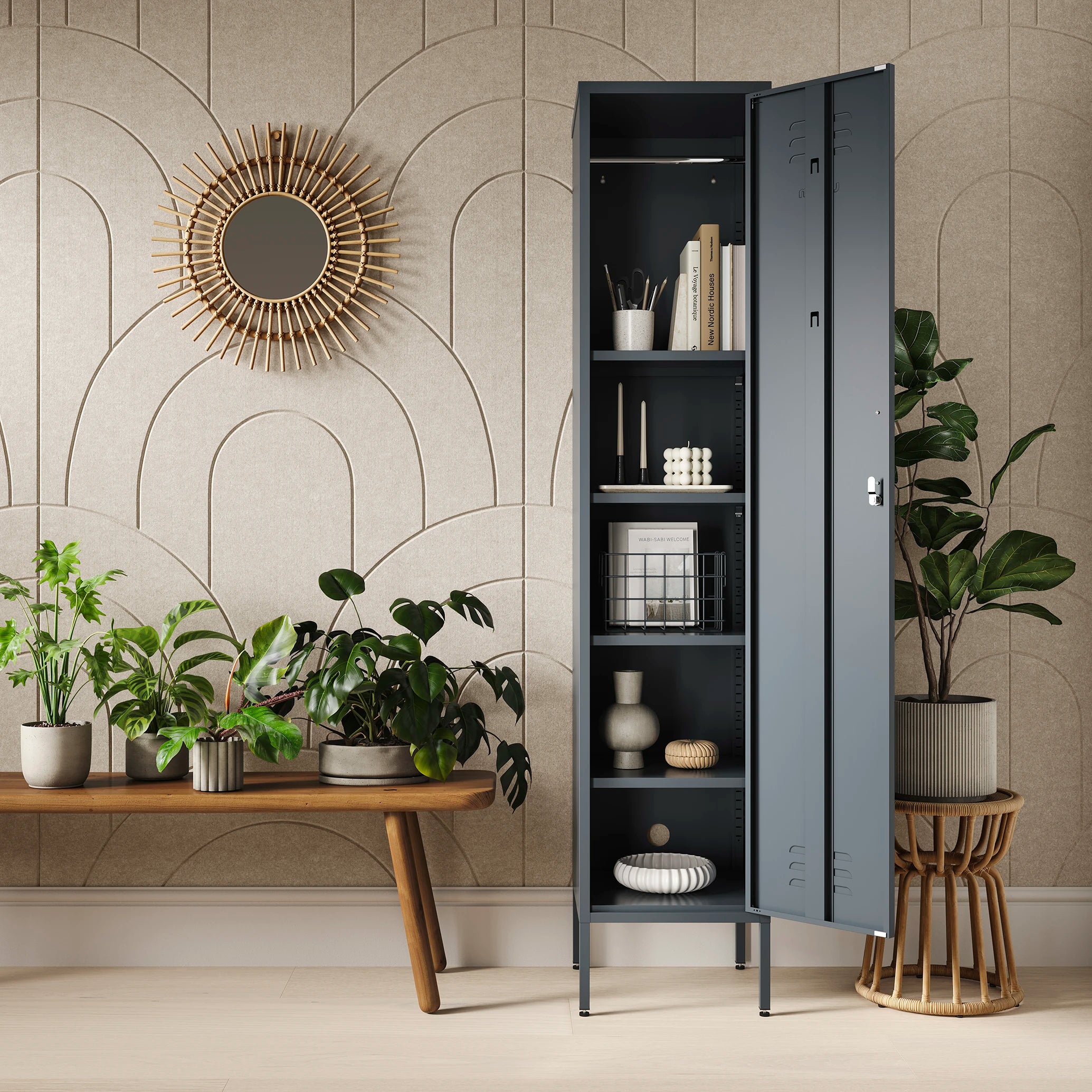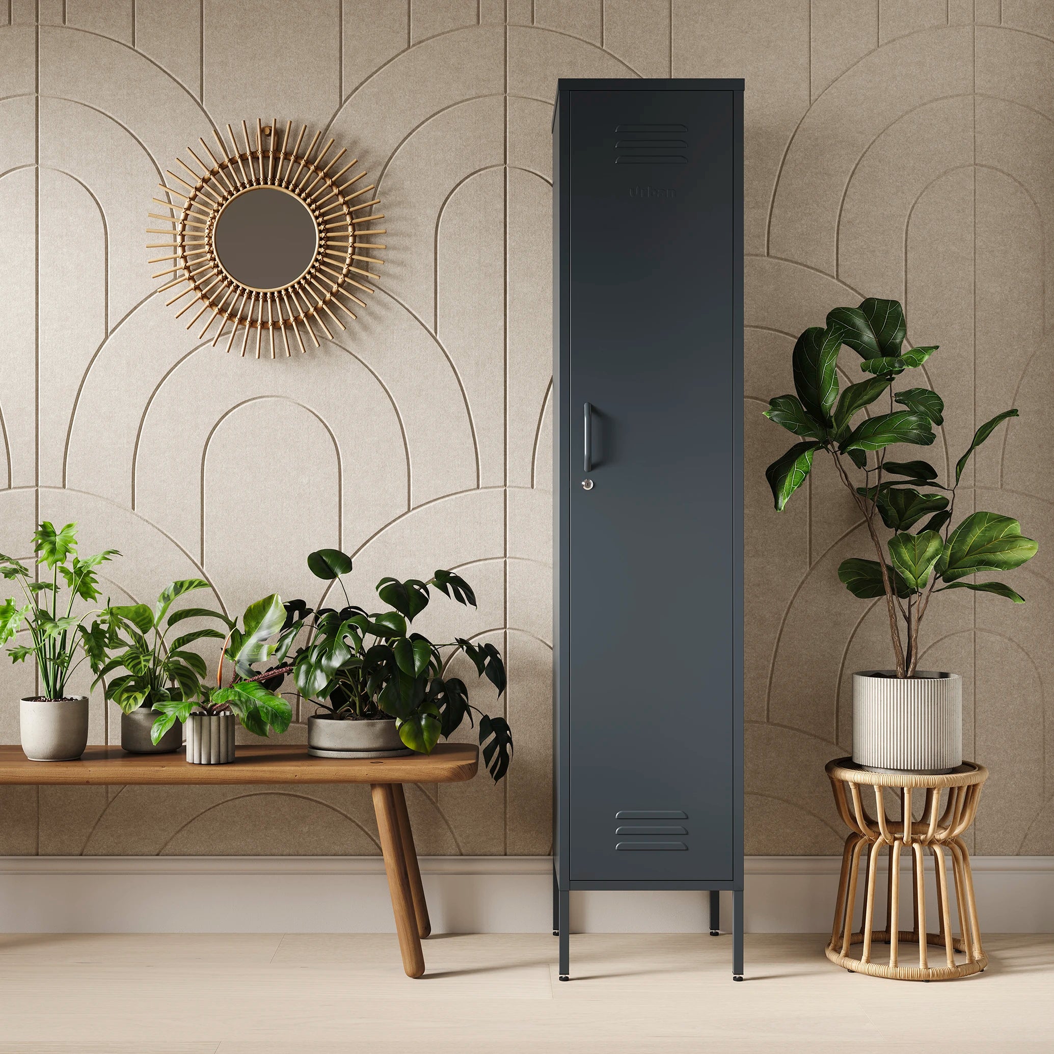 The Bexley single-door tall storage locker in slate grey, next to some plants