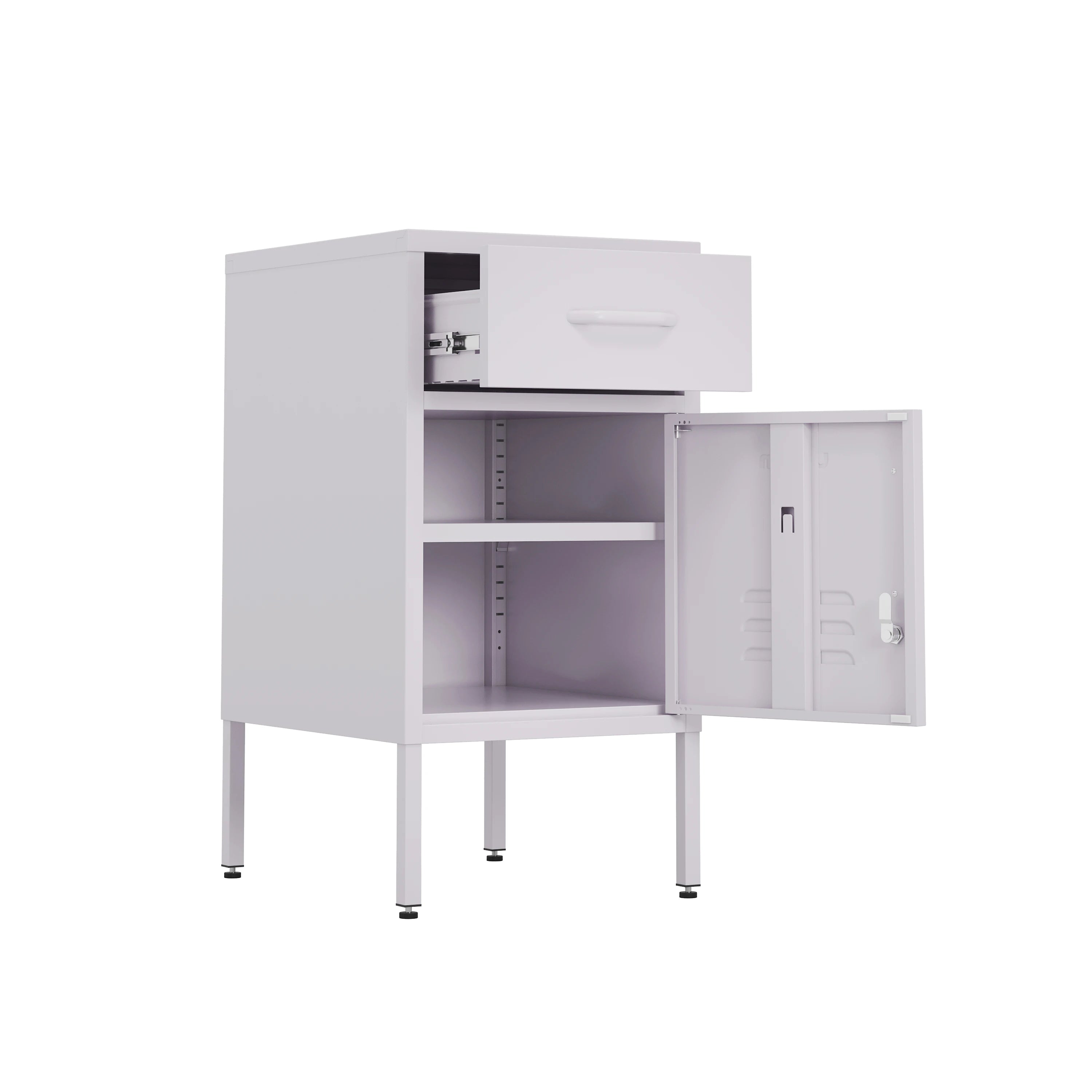 Metal, tall, double-door and single-drawer storage locker and a metal side table locker with one drawer and one door, both in forest green in a room next to a bed