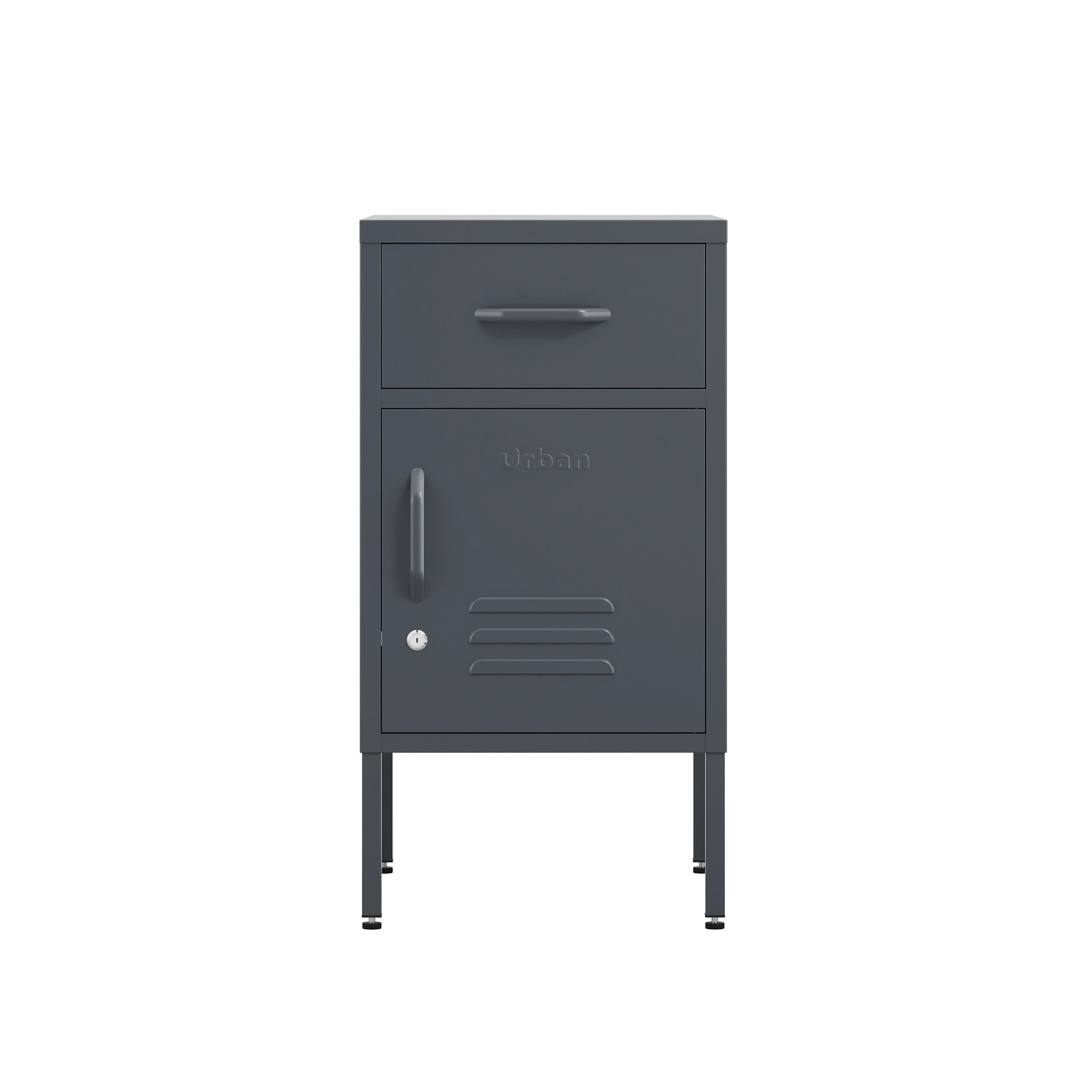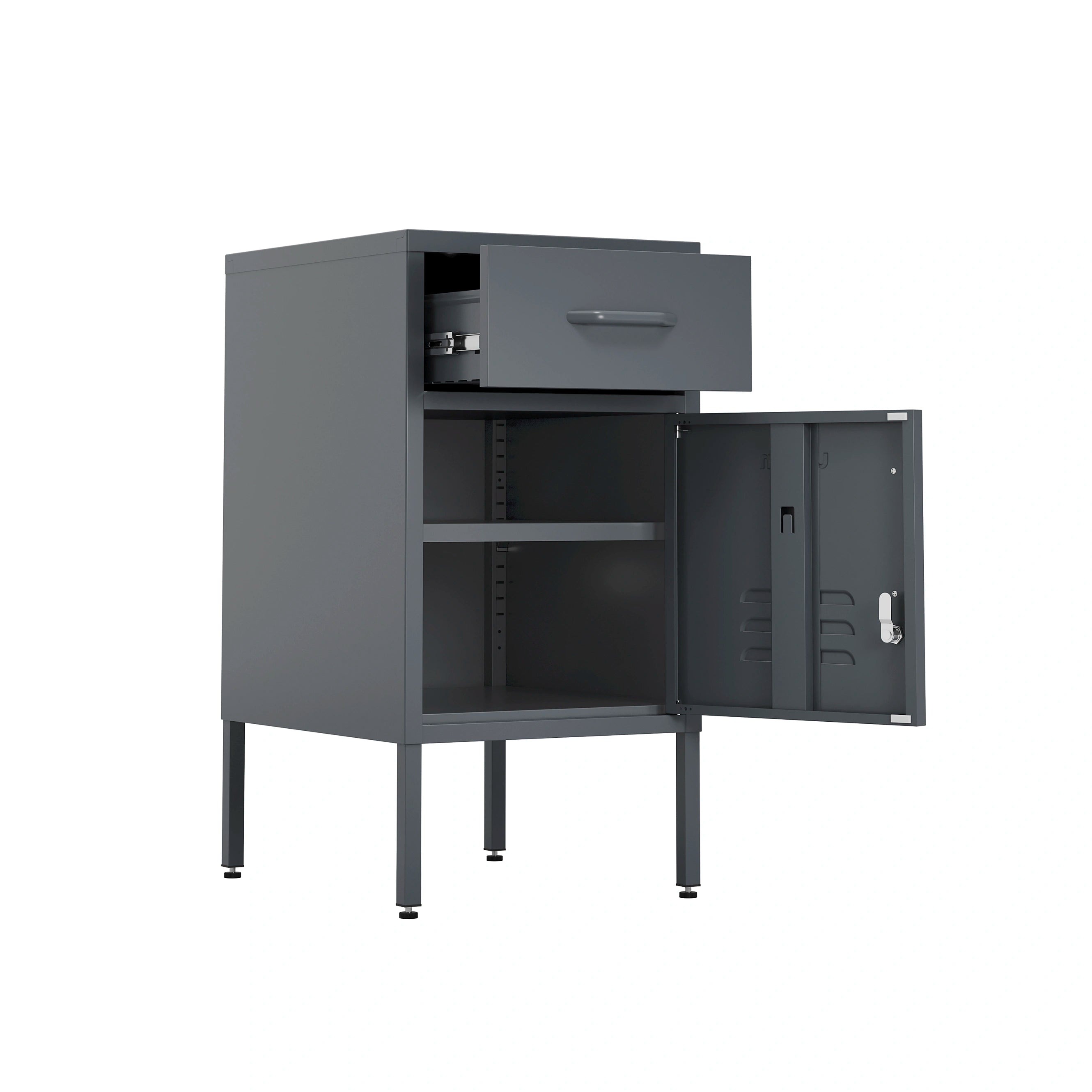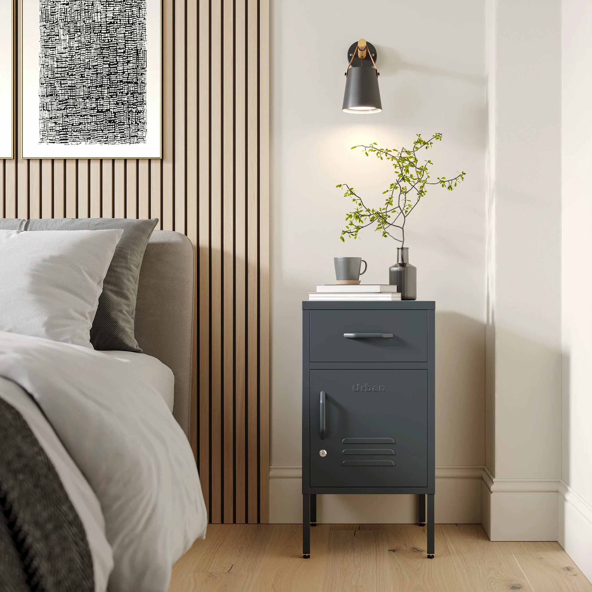 Metal side table locker in slate grey with one drawer and one door, in a room next to a bed