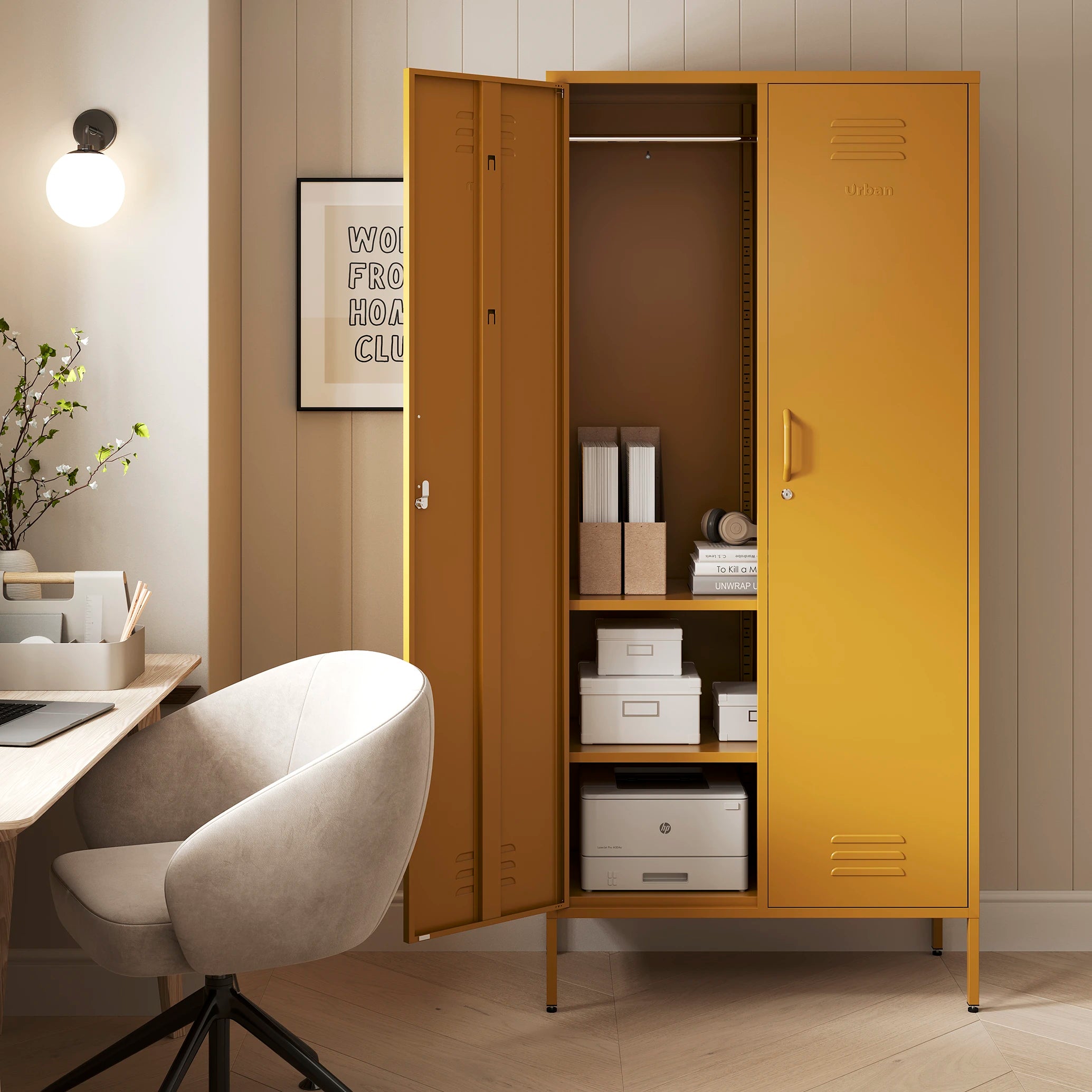The Chelsea tall double-door metal storage locker in mustard yellow in a room