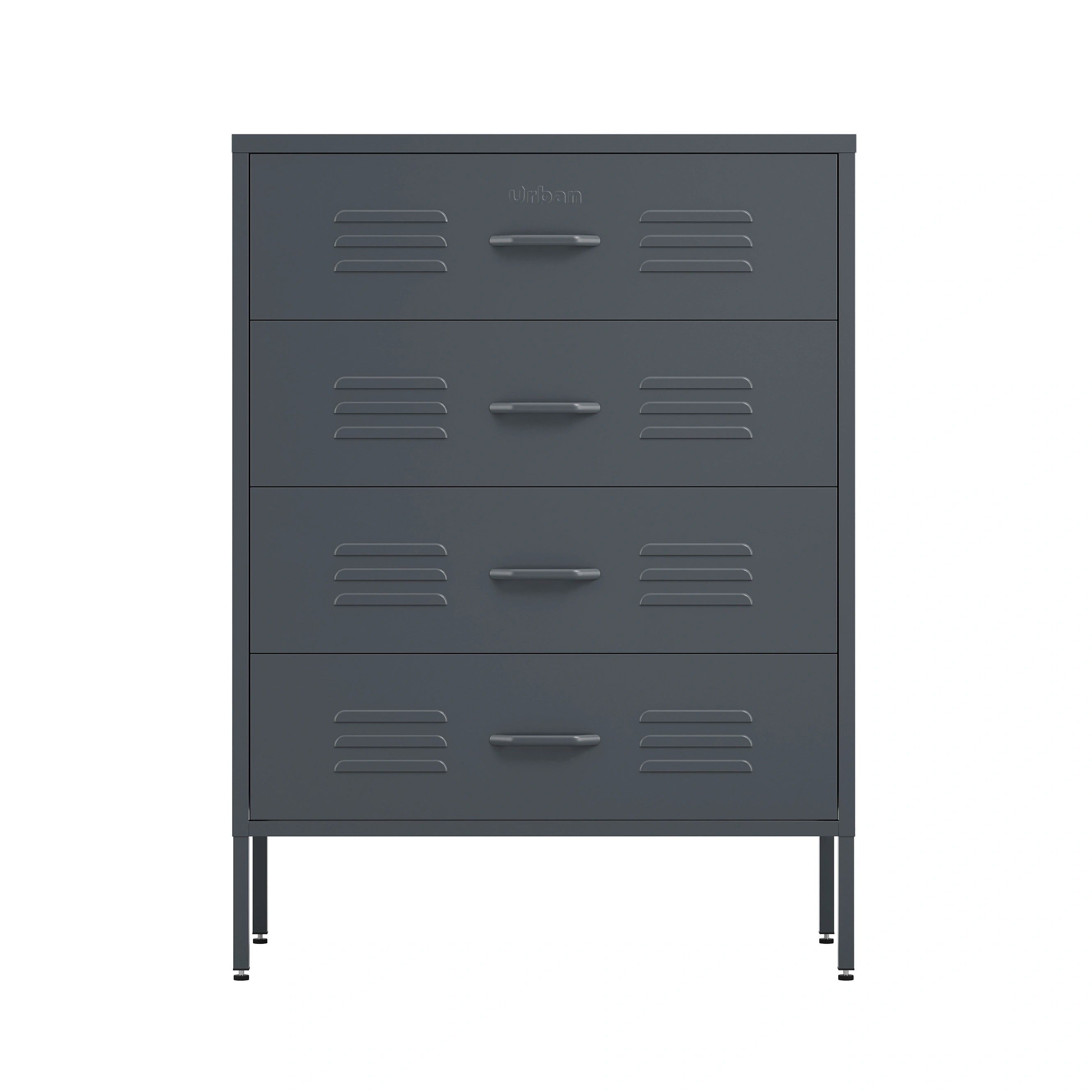 For a sleek, modern storage solution, the Slate Grey Harrow metal drawer locker is a perfect choice. This four-drawer locker provides a stylish yet practical way to store clothes, towels, or office essentials. The smooth-gliding metal drawers make access easy, while locker drawer vents ensure breathability. With wall-mounting holes and adjustable feet for added stability, this slate grey locker works just as well as a contemporary bedroom drawer locker as it does in an office or hallway.