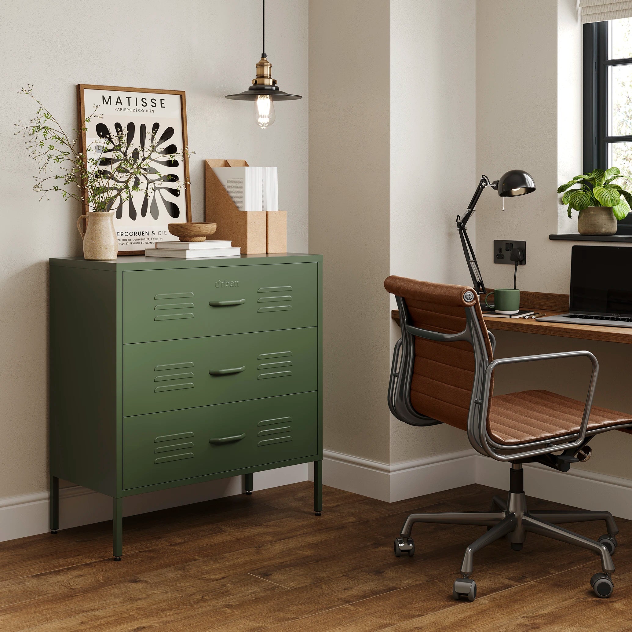 The Lambeth metal drawers in forest green, in a room next to a desk