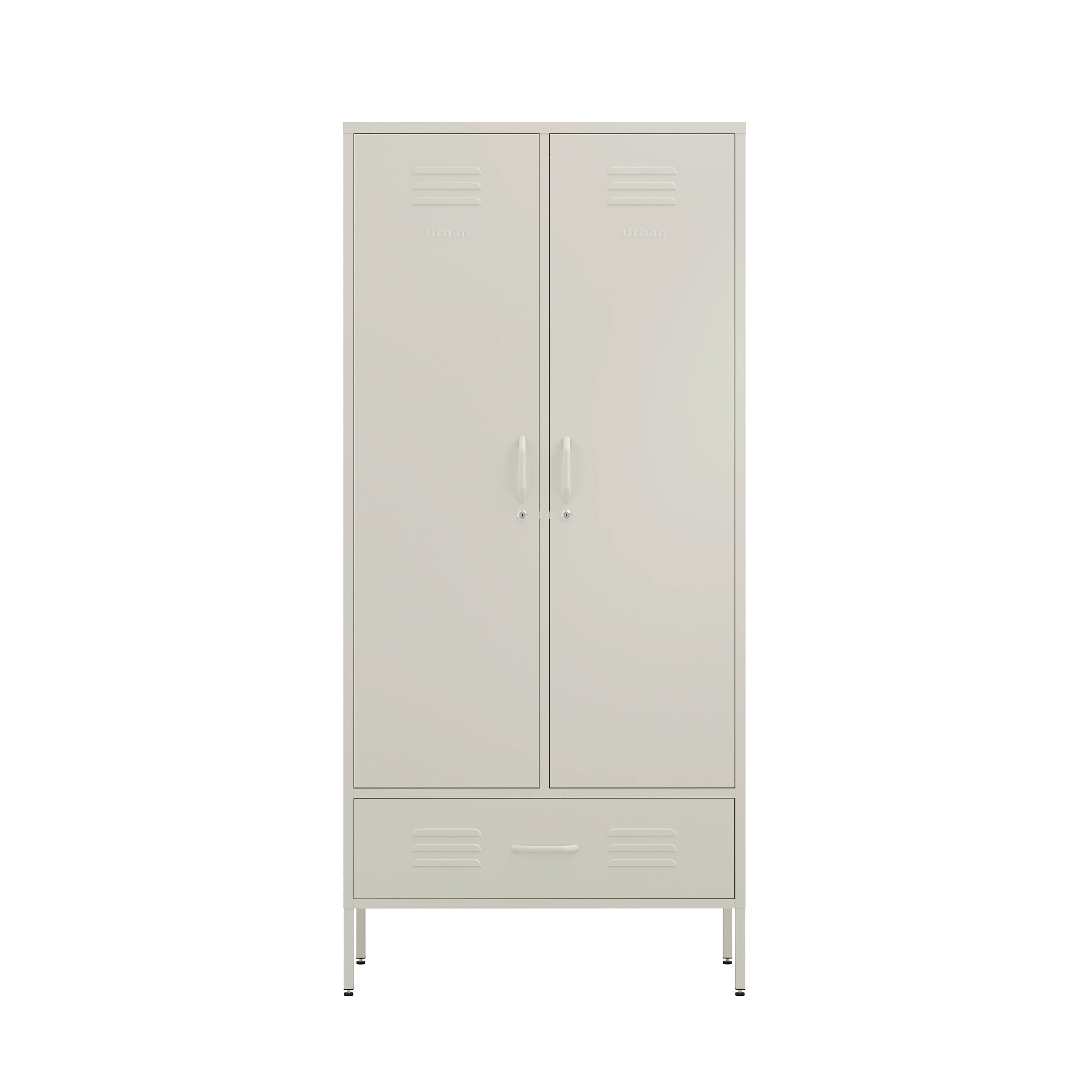 Metal, tall, double-door and single-drawer storage locker in vanilla, in a bedroom