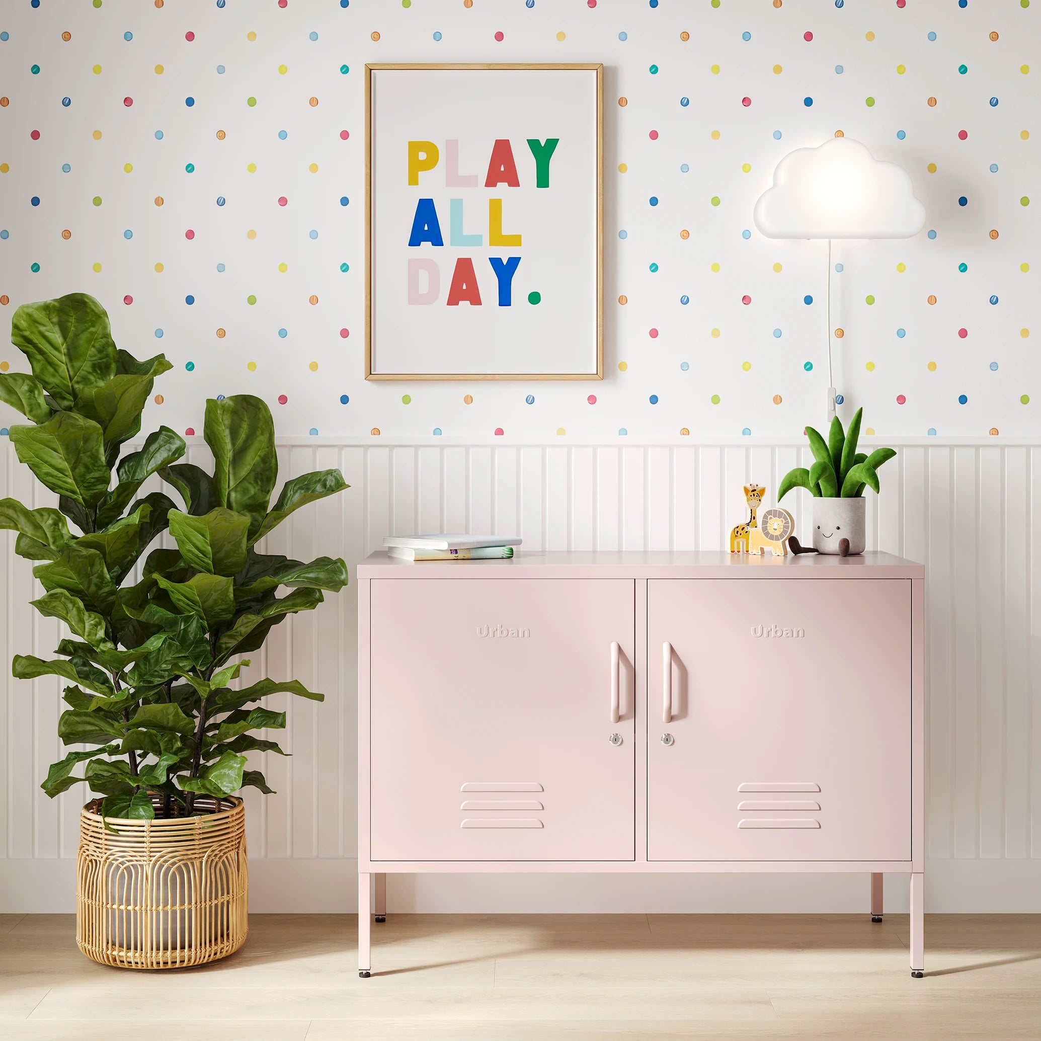 The Oxford metal storage locker in light pink with two doors, with books and toys on top